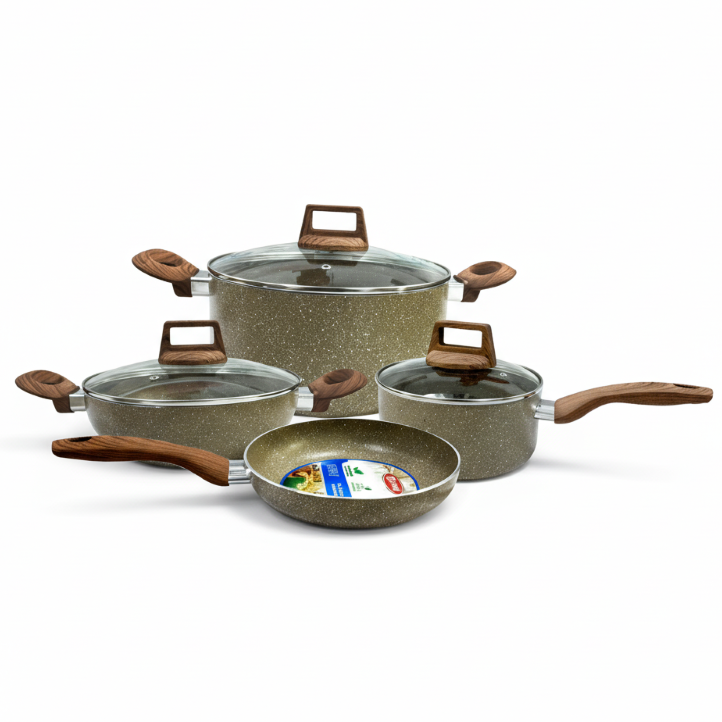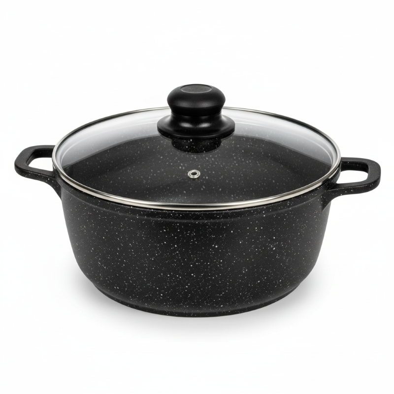 The Kiam Non-Stick Cookware is expertly designed for effortless cooking and easy maintenance. Made with premium-grade non-stick coating, it ensures even heat distribution and prevents food from sticking. The cookware features a sturdy granite-textured body, durable handles for a firm grip, and a transparent glass lid for convenient monitoring while cooking.