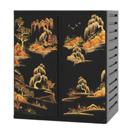 This elegant two-door Multipurpose Almira, featuring the distinctive "Sonali" design, this three rack shoe cabinet offers a unique blend of functionality and traditional artistry. Made from high-quality, durable plastic, it provides a lightweight, easy-to-clean, and moisture-resistant storage solution. The almira is distinguished by its dramatic black base color adorned with rich gold and yellow traditional-style landscape decals, depicting mountains, pagodas, trees, and flying birds. With its compact measurements of (Length x Width x Height), it is perfect for smaller living spaces. A key feature is the inclusion of a lock, adding necessary security. The "Sonali" almira is an excellent choice for those seeking a practical yet stylish piece that complements both modern and classic decor.