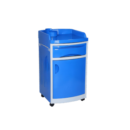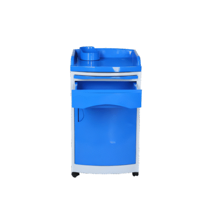 This Hospital bedside cabinet is crafted from high-quality ABS and stainless steel, ensuring durability and easy cleaning. Designed with a sleek blue-and-white finish, it features a spacious top with a utility holder, a smooth sliding drawer, and a lower cabinet for organized storage. Its rounded edges and sturdy wheels provide safety and easy mobility. Ideal for hospitals, clinics, and nursing homes, this cabinet keeps essential medical items within reach while maintaining a clean, professional look.
