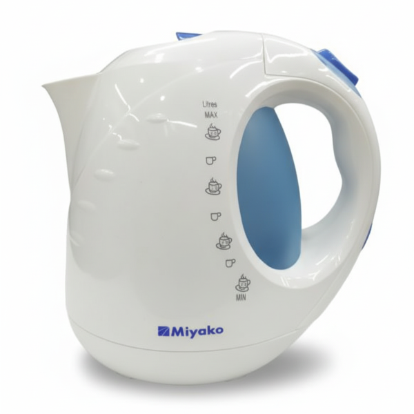 This Miyako Electric Kettle features a modern body with a sleek finish and ergonomic handle for comfortable grip. The 360° cordless base adds convenience, while the LED indicator enhances its stylish appearance.