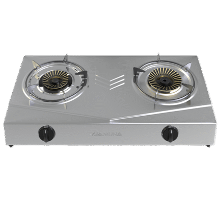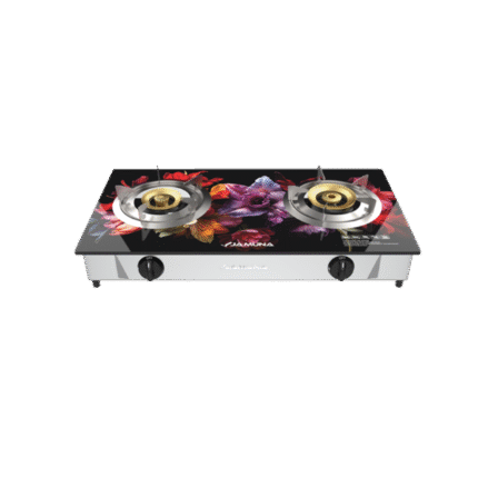 High-quality 2-burner gas stove with a durable toughened glass top and heavy-duty brass burners for efficient flame distribution. Equipped with smooth, heat-resistant knobs and sturdy anti-skid rubber legs for stability.