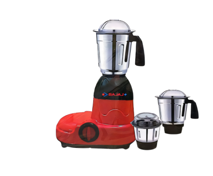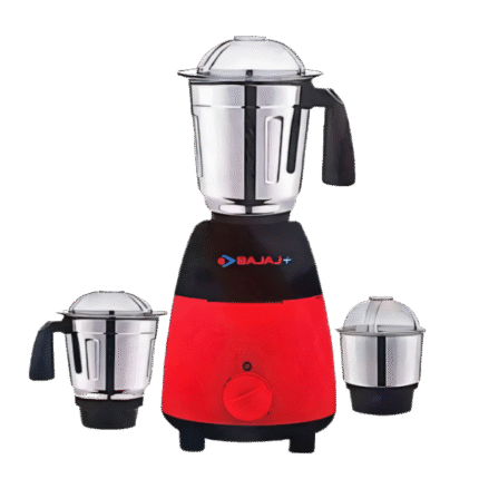 Experience superior grinding with our sleek red and black mixer grinder. It features a powerful motor and three versatile stainless steel jars (liquidizing, grinding, chutney). Sharp blades, three-speed control with incher, and overload protection ensure precision and safety. Its compact design ($\approx 38-40$ cm high) and easy maintenance make it ideal for daily kitchen use in modern households.