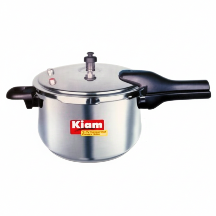 The Kiam Premium Pressure Cooker is crafted from high-grade aluminum for fast, even cooking and long-lasting durability. Its sleek silver body with sturdy black handles ensures both style and comfort. Featuring a secure locking lid, safety valve, and heat-resistant handles, it guarantees safe and efficient use. Ideal for gas stoves, this cooker helps save time and energy while preparing rice, meat, lentils, or stews. Perfect for both home and restaurant kitchens.