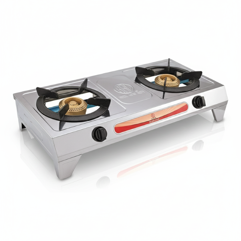 High-quality 2-burner gas stove with a durable toughened glass top and heavy-duty brass burners for efficient flame distribution. Equipped with smooth, heat-resistant knobs and sturdy anti-skid rubber legs for stability.