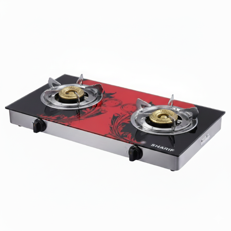High-quality double-burner gas stove with a durable toughened glass top and heavy-duty brass burners for efficient flame distribution. Equipped with smooth, heat-resistant knobs and sturdy anti-skid rubber legs for stability.