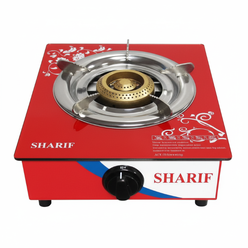 The Sharif 1-Burner Gas Stove combines elegance, durability, and performance for modern kitchens. Featuring a toughened glass top with a sleek black and red finish, it adds a stylish touch to your cooking space. The two high-efficiency brass burners ensure even flame distribution for faster cooking, while the heat-resistant knobs and anti-skid rubber legs provide safety and stability. Its stainless-steel body is rust-resistant and easy to clean, making it ideal for daily use. Perfect for small to medium-sized families, this gas stove delivers reliable performance with a modern design that enhances both function and style.