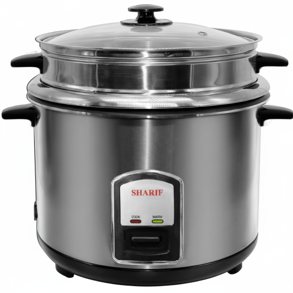 The Sharif Electric Rice Cooker is made with durable stainless steel and high-quality heating elements for quick and even cooking. It has a 2.8L capacity, perfect for medium to large families.