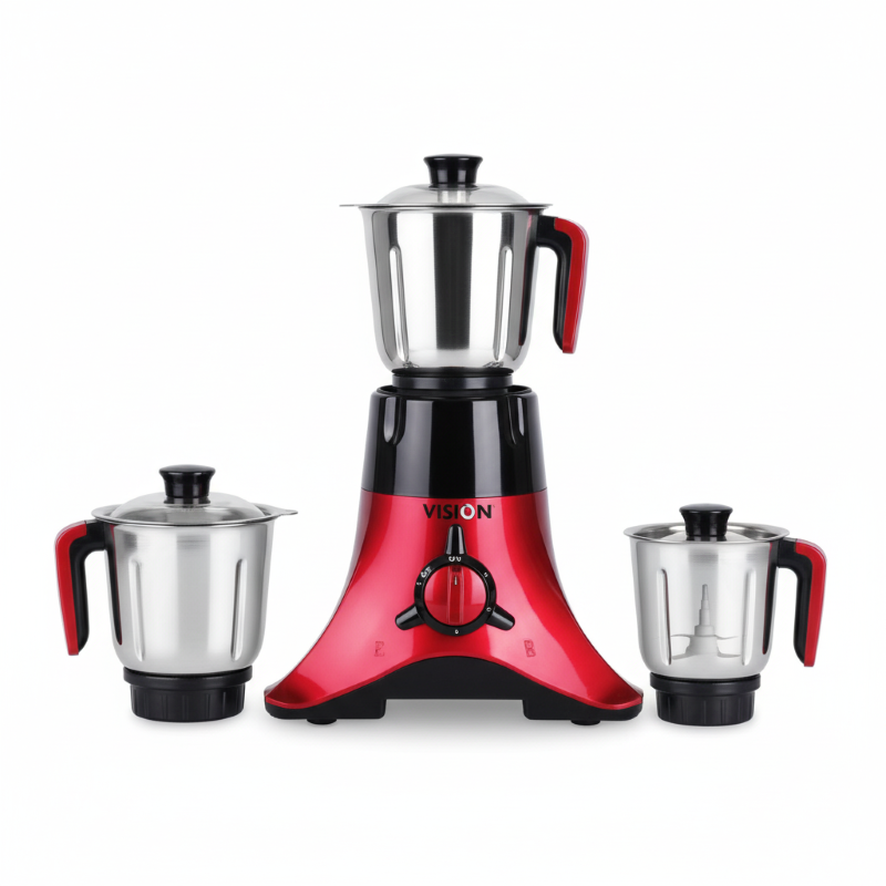 This Vision Mixer Grinder is a powerful 750W appliance designed for efficient and versatile kitchen use. It includes three stainless steel jars for liquidizing, grinding, and chutney preparation. The sleek red and black body adds a modern touch, while ergonomic handles ensure comfortable use. Equipped with sharp stainless-steel blades, three-speed control, and overload protection, it guarantees consistent performance and safety. Ideal for blending, grinding spices, preparing chutneys, or making batters, this mixer grinder is a perfect addition to any modern kitchen, combining durability, style, and functionality for everyday cooking convenience.