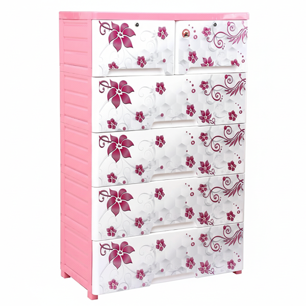 This durable plastic cabinet Large size (approx. $135\text{ cm} \times 75\text{ cm}$) features 6 spacious, smooth-sliding drawers for efficient, organized storage. The rich dark brown finish with elegant yellow and blue floral patterns adds a sophisticated touch to any room. It’s lightweight, sturdy, and resistant to moisture and dust, making it ideal for clothes, toys, or documents in bedrooms, offices, or living rooms.