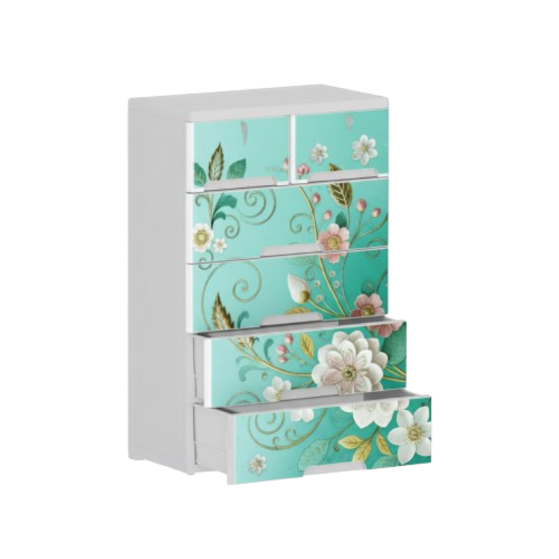 This elegant multi-drawer storage cabinet combines style and practicality for any modern home. Made from durable, high-quality plastic, it features six spacious drawers that offer ample storage for clothes, accessories, toys, or documents. The rich finish with floral designs adds a vibrant, decorative touch to your space. With a smooth sliding mechanism and sturdy build, it ensures convenience and long-lasting use. Ideal for bedrooms, living rooms, or offices, this cabinet keeps your essentials neatly organized while enhancing your interior décor.