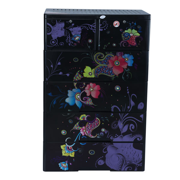 Large size made from ABS & Polypropylene, it measures 88 / 47.5 / 137 cm and features five drawers. The shiny design is complemented by an insects repellent masterbatch and convenient wheel facility for easy movement.